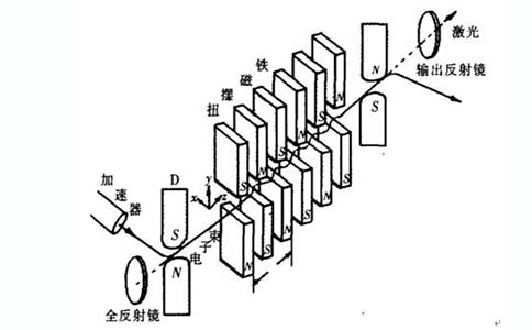 從加速器輸出的相對論電子束橫穿過周期性變化的波振器靜磁場。磁場方向與電子束垂直,故穿過的電子束被迫進行橫向振蕩,并向前方發射磁軔致輻射。在高能電子和光子的散射過程中,電子運動方向上的散射光子的頻率可由能量和動量守恒定律決定,波振器使聚焦的電子束在與光子束相互作用的整個過程中,始終保持在直線方向上。當電子束和光子束密度足夠大時,便形成受激散射,產生自由電子激光。自由電子激光器的輸出激光波長與電子能量有關,改變電子束的加速電壓就可以改變激光波長,這稱為電壓調諧。其調諧范圍很寬,原則上可以獲得任意波長的激光。