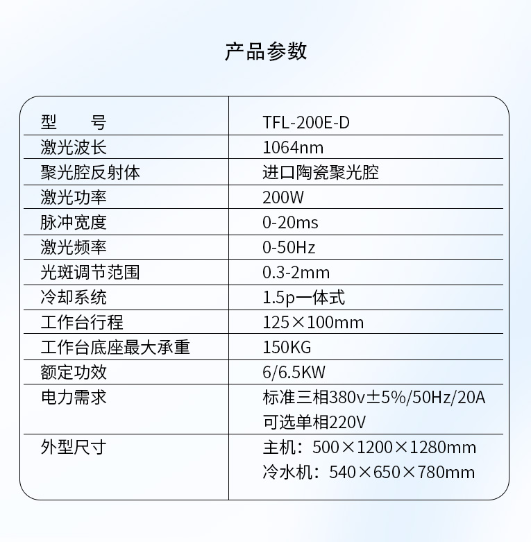 出口型模具激光焊機(jī)是通發(fā)激光公司專門為出口國外客戶使用而設(shè)計(jì)的系列機(jī)型TFL-200E-D,配置激光頭電動(dòng)升降,同時(shí)配置操縱桿無極調(diào)速控制XY橫向和縱向電動(dòng)移動(dòng)。適用于各類精密注塑模具、壓鑄模具等模具激光修補(bǔ)焊接;同時(shí)也適合鑄件沙孔激光修補(bǔ)、模具崩缺激光修復(fù)、過切加工等的激光修補(bǔ);各類金屬結(jié)構(gòu)件、金銀首飾的激光焊接加工。